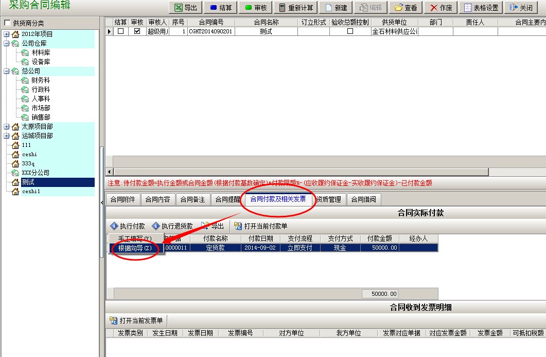 然后打開合同付款及相應發票,點執行付款,選擇第二項根據向導。
