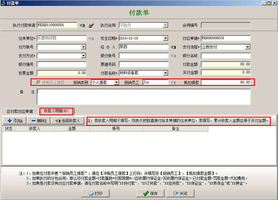 (5)因為錢是直接給的員工,所以在做【付款申請單】或【付款單】時,注意“收款人明細”中寫名收款為墊付的員工。往來單位要寫明真實單位,如果是不具名的單位,可以提前在基礎信息的【往來單位維護】中添加一個名稱為“零星”的單位,統一處理類似費用的支出。如下圖: