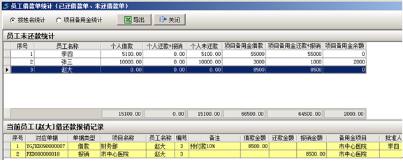 付款申請單填寫完畢后,需要多級審核通過,審核通過后由財務執行生產付款單,當付款單生成完畢后,我們可以查看員工借款單統計,其中趙大的借款中,報銷一欄出現8500,,說明已經報銷完畢。如下圖: