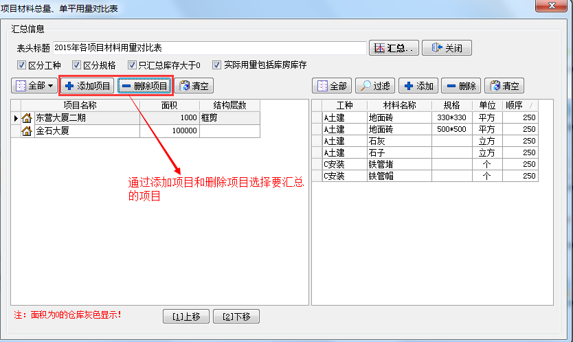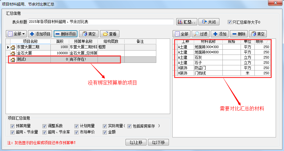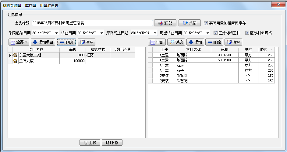 1、窗口左邊的表格為企業(yè)現(xiàn)有的項(xiàng)目信息,右邊的表格為材料維護(hù)中的材料信息。