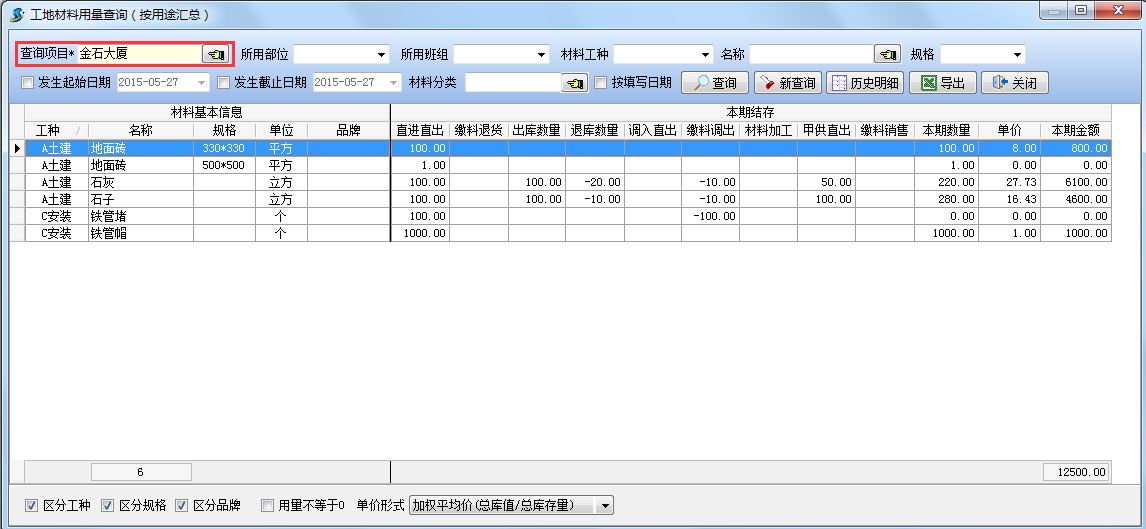 如下圖:查詢項(xiàng)目【金石大廈】所有石子的歷史明細(xì),(通過(guò)【模糊查詢】)。