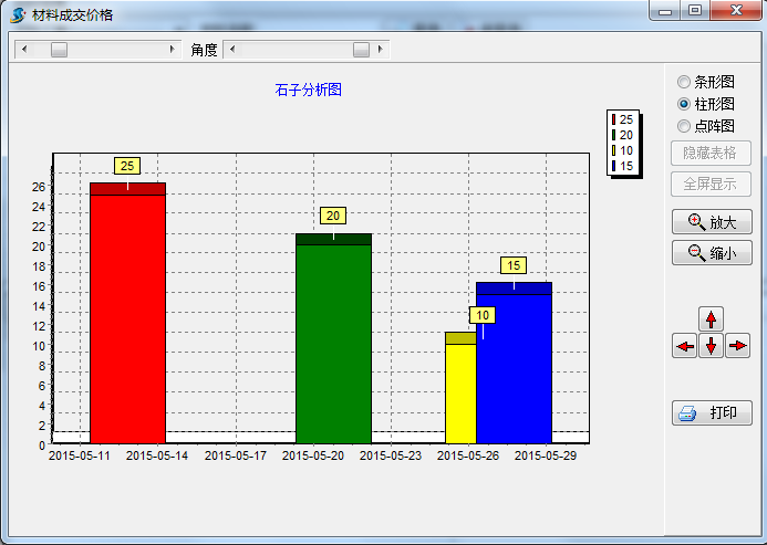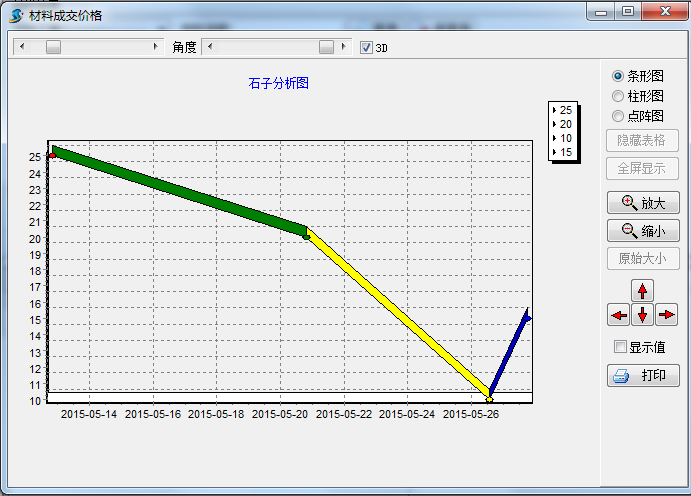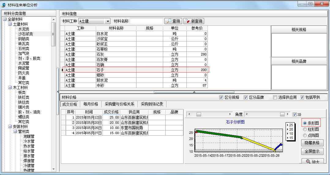在工程項(xiàng)目管理系統(tǒng)中【材料成交價(jià)格分析圖】是用來(lái)查詢?cè)牧铣山粌r(jià)格的分析圖表,界面如下:
