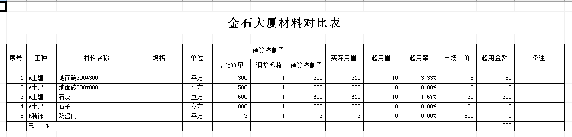 查詢結(jié)果如下圖:因?yàn)轫?xiàng)目【東營(yíng)大廈二期】只有材料 【石灰】、【石子】和【地面磚330*330】的發(fā)生記錄。所以該項(xiàng)目上只能看到這兩個(gè)材料的對(duì)比結(jié)果。