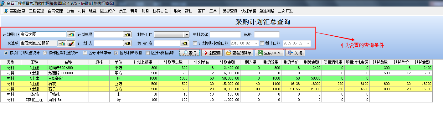 在工程項(xiàng)目管理系統(tǒng)中【采購(gòu)計(jì)劃執(zhí)行匯總】 可以設(shè)置多重條件來(lái)匯總所有的【采購(gòu)計(jì)劃單】的執(zhí)行情況,如下圖: