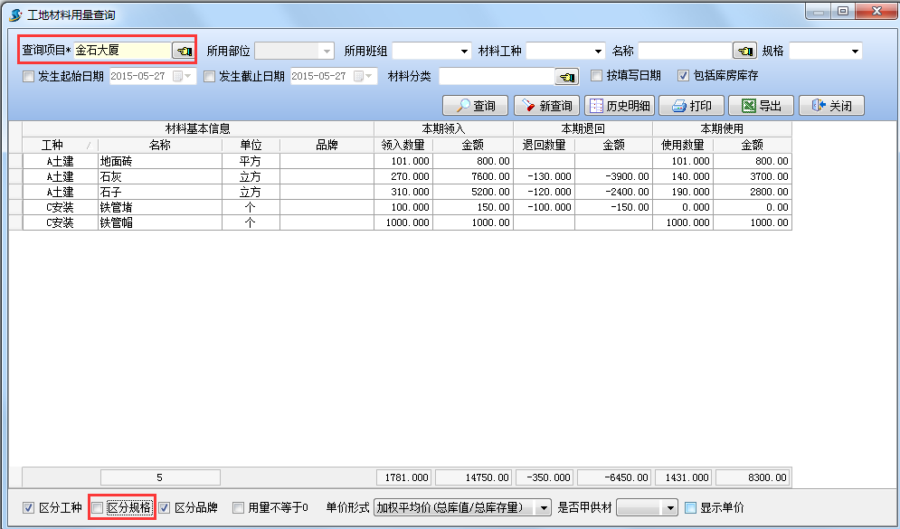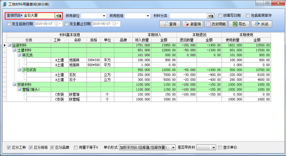 在工程項(xiàng)目管理系統(tǒng)中設(shè)置取消下面的過(guò)濾選項(xiàng)"用量不等于0,查詢結(jié)果如下圖: