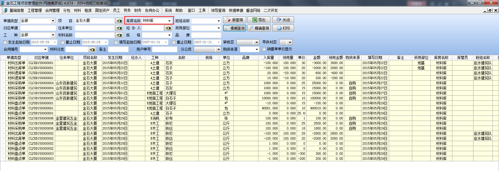設(shè)置查詢項(xiàng)目為【金石大廈】,查詢結(jié)果如下圖:查詢當(dāng)前項(xiàng)目【金石大樓】(包括所有庫(kù)房)的材料庫(kù)存情況。