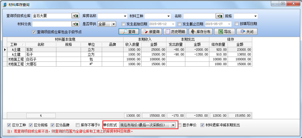 當(dāng)單價(jià)形式設(shè)置為【最后一次采購(gòu)價(jià)】進(jìn)行查詢時(shí),可以得出當(dāng)前項(xiàng)目材料的庫(kù)存總值,如下圖: