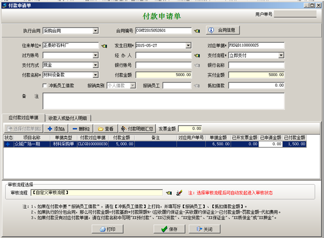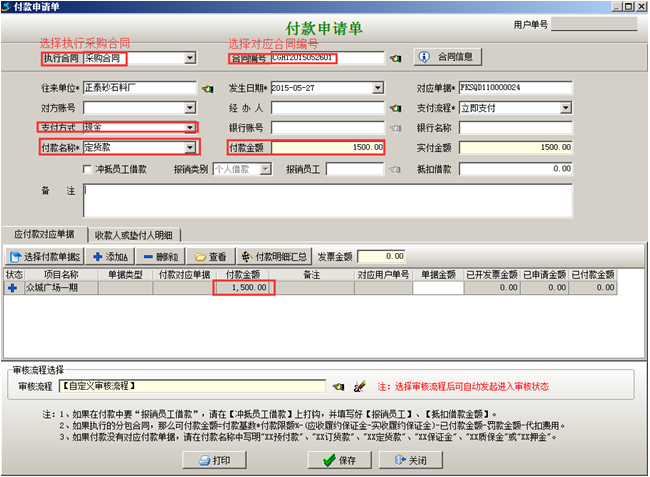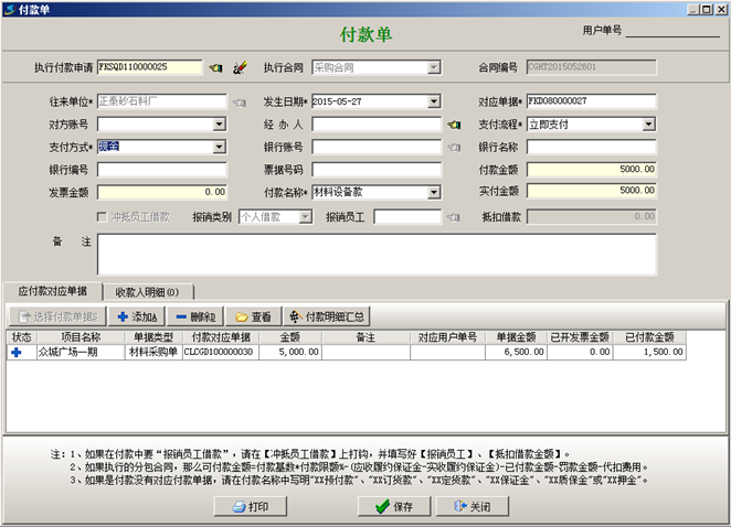 在工地現(xiàn)場材料管理過程中,如果工地現(xiàn)場采購大量材料需要簽訂采購合同并在到貨之前付預(yù)付款時,我們要在采購合同中,選中對應(yīng)的采購合同,點擊[合同付款及相關(guān)發(fā)票],點擊[執(zhí)行付款]-[手工填寫]彈出“付款申請單”,在“付款申請單”中選擇執(zhí)行“采購合同”,并選擇對應(yīng)的“合同編號”,選擇“支付方式”,選擇“付款名稱”為“訂貨款”,并在“付款金額”里面輸入“預(yù)付款”金額,“付款申請單”添加完成之后點擊[保存]的按鈕保存單據(jù),如圖: