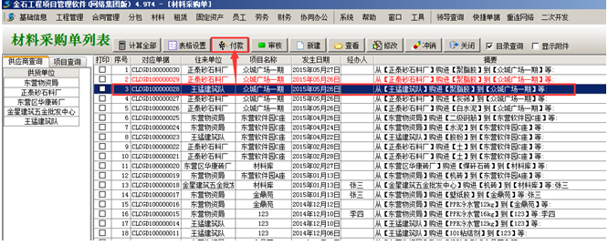 在工地現(xiàn)場材料管理過程中,如果沒有采購合同,材料采購入庫之后,可在“材料入庫單”列表里面,選中單據(jù),直接點擊[付款]按鈕,添加[付款申請單],執(zhí)行付款。如圖: