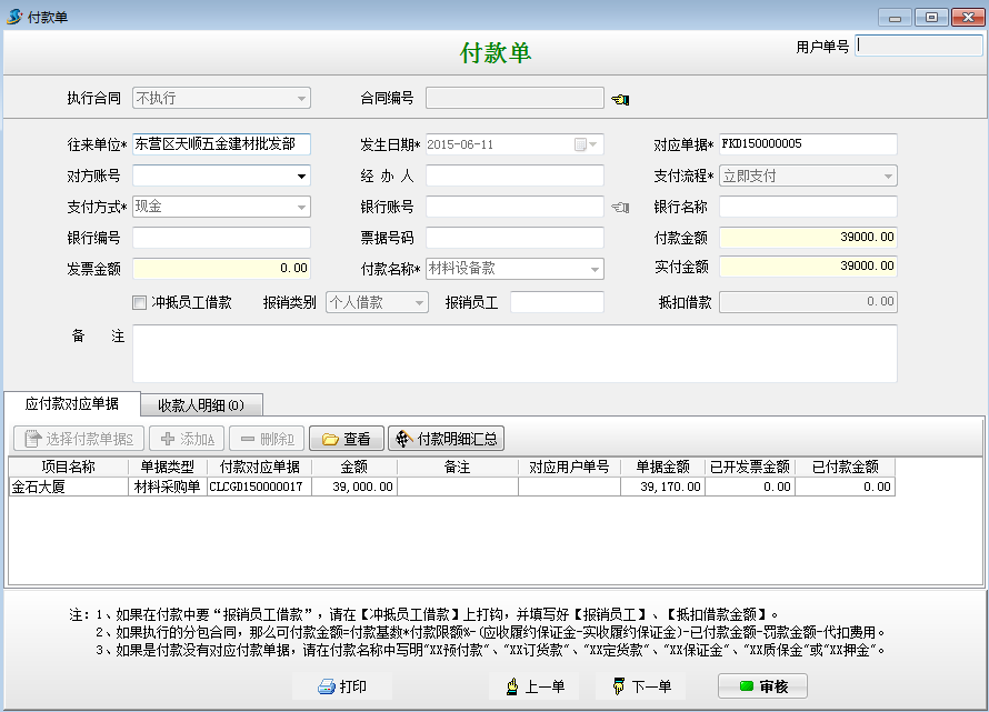 填寫完成就可以對(duì)單據(jù)進(jìn)行付款。