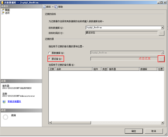 選擇“還原”后進入“還原數據庫”窗口,目標數據庫默認已經選擇需要還原的數據,接著在“還原的源”中的選擇“源設備(D)”,單擊“源設備((D)”右邊的“…”按鈕,如圖:
