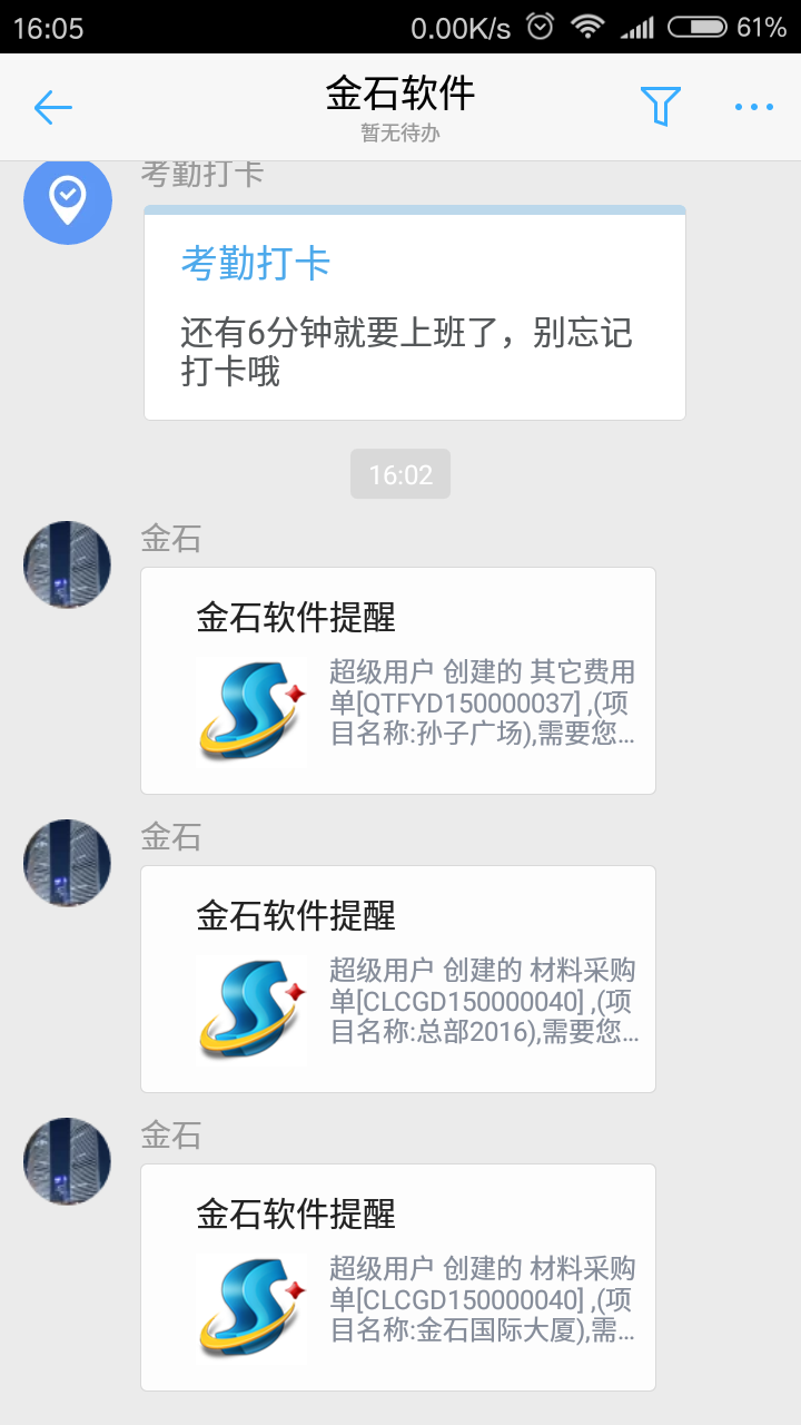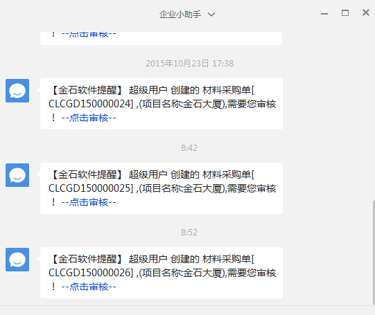 用超級用戶設(shè)置好微信認(rèn)證之后在,當(dāng)單據(jù)創(chuàng)建人發(fā)起審核后,審核過程中的人都會(huì)收到微信提醒信息。微信如下圖: