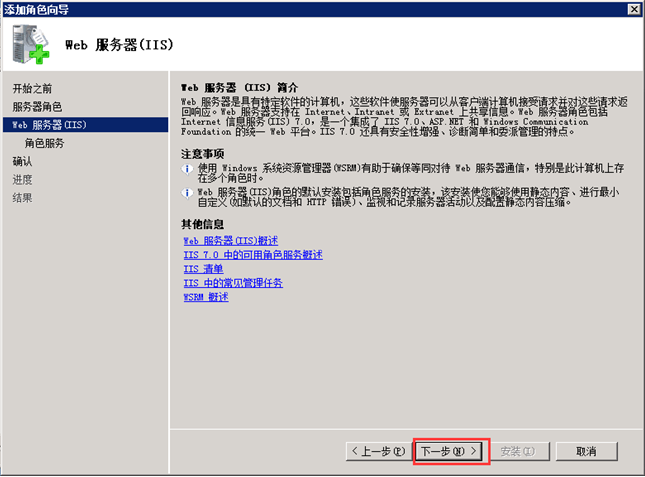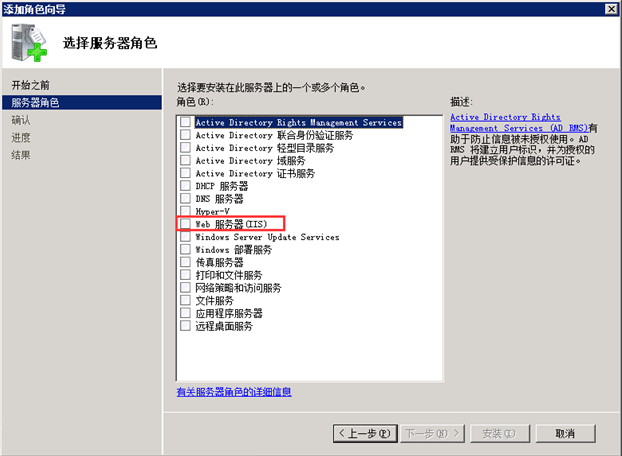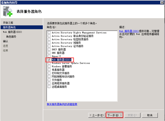 第二步,選擇服務器角色,在“Web服務器(IIS)”的復選框中打鉤。如圖: