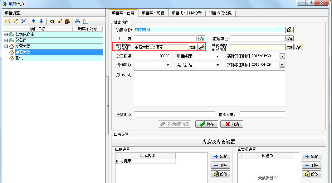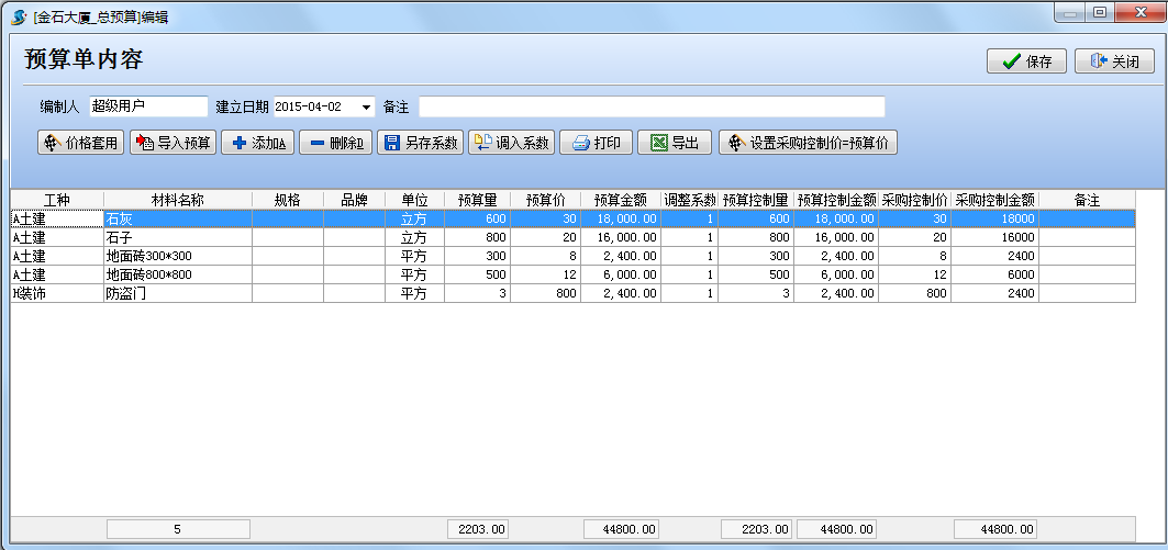 如圖在工程項目管理系統中建立一個金石大廈的材料預算單