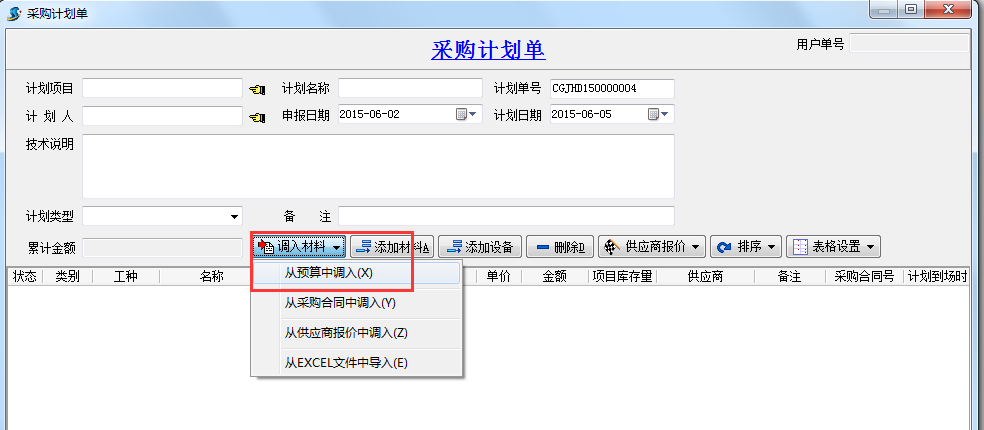 工程項目管理系統新建采購計劃單時,添加材料內容選擇從預算中調入,如下圖