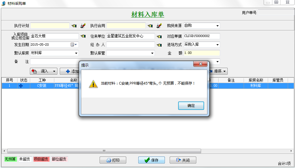 在填寫工程項目采購計劃單,材料入庫單,材料出庫單,材料調撥單時都會根據預算單來進行相應的顏色提示。