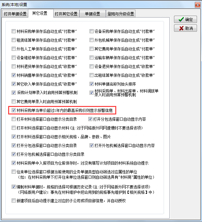 備注:獲得此項提示需要打開開關【系統維護】-【系統本機設置】-[其他設置]- [材料采購單當單價超過一年內的最高采購價則顯示報警信息]處打上勾 。如下圖
