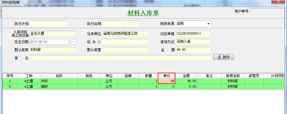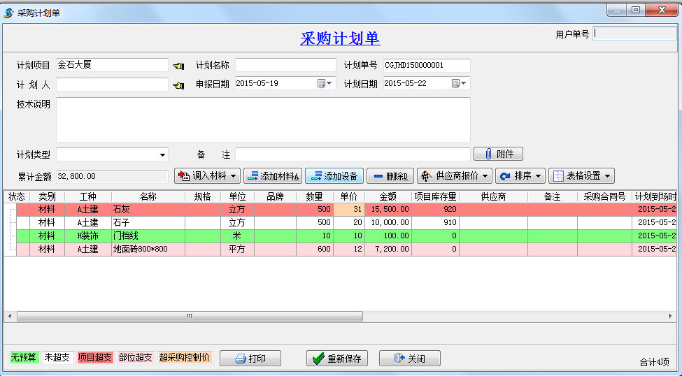 綁定好項目之后,在填寫材料相關單據時,會根據預算單的價格和數量進行不同顏色的顯示。這里我們以采購計劃單為例進行說明。