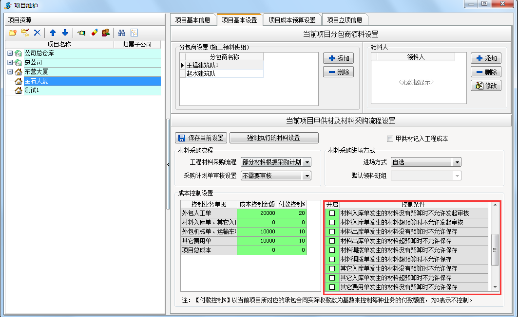 在工程項目管理系統中選好控制條件在開啟處打上勾。例如我們選定材料入庫單發生的材料沒有預算不能允許保存。