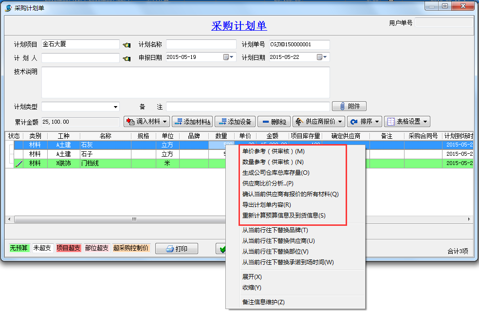 在工程管理軟件中企業(yè)制定合理的采購計劃,可以有效地規(guī)避風(fēng)險,減少損失;更有利于資源的合理配置,以取得最佳的經(jīng)濟效益;同時又為企業(yè)組織采購提供了依據(jù)。