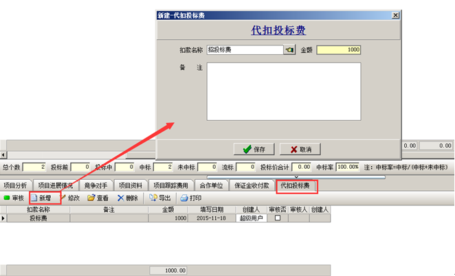 單據創建完成,系統在“還回金額”中扣除【代扣投標費】。如圖: