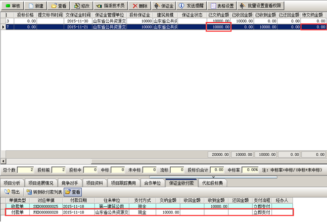 收款完成,工程管理軟件中會顯示已收到金額以及投標保證金的收付款記錄。如圖所示: