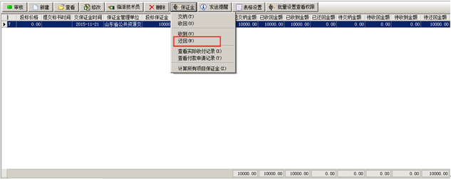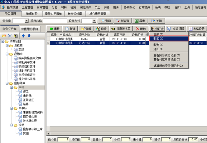 我方要從“保證金管理單位”將投標保證金收回。工程管理軟件的項目開拓中選中對應的項目,在“保證金”菜單中選擇“收回”,如圖所示: