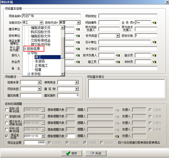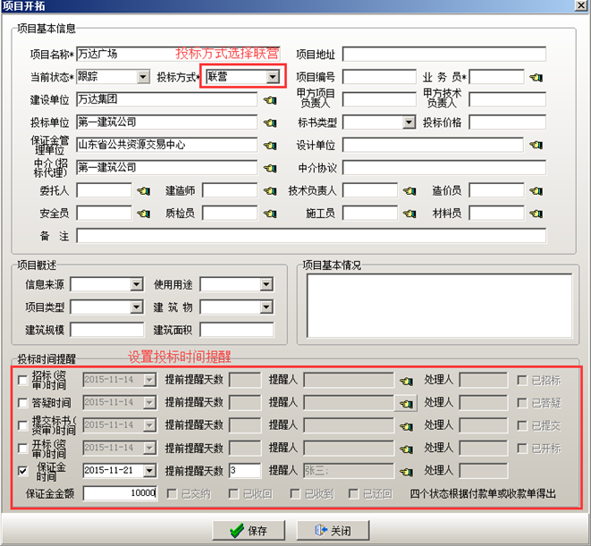 項目狀態編輯維護完成之后可在工程管理軟件中建立項目。在工程管理軟件的“項目開拓”中輸入包括個往來單位以及負責人等項目基本信息。也可在投標時間提醒里面設置“招標(資審)時間”,“答疑時間”,“提交標書時間”,“開標時間”,“保證金”提醒時間,時間設置完成之后,被提醒的用戶會在相應的時間收到相關的提醒內容。投標保證金,在投標保證金對應的復選框打鉤,設置投標保證金的時間,提前提醒的天數,被提醒人以及金額。如圖所示: