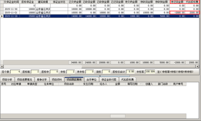 投標保證金還回給掛靠單位。項目開拓中會提示“待還回金額”。如圖所示: