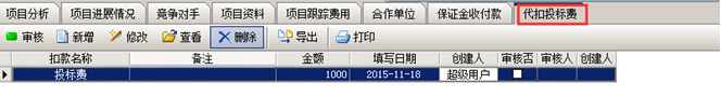 在聯營項目中,還回投標保證金時,如果有“代扣投標費”,則在工程管理軟件的項目開拓中建立“代扣投標費”單據。如圖: