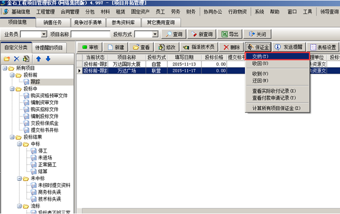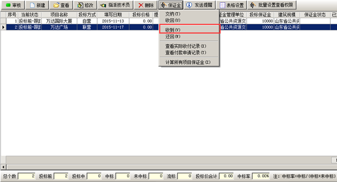 掛靠單位將投標保證金交給我方。我方在工程管理軟件的項目開拓列表中找到對應項目,在“保證金”菜單中點擊“收到”,如圖: