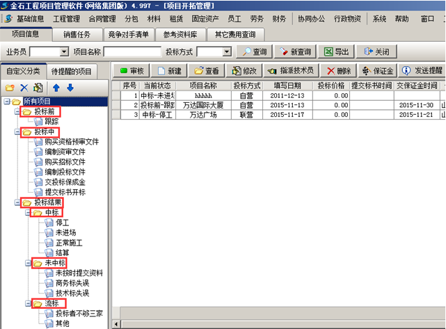 在金石工程管理軟件中,項目是在系統的“項目開拓”中建立項目開始的。 根據項目所處的階段在工程管理軟件的項目開拓中建立項目基本信息。工程管理軟件中項目開拓階段項目有三個狀態:“投標前”、“投標結果”,“投標結果”包括“中標”、“未中標”和“流標”,系統定義的項目的基本狀態不可編輯或更改,若項目有其他狀態可在個基本狀態下建立子狀態,子狀態的名字可進行編輯。如圖所示: