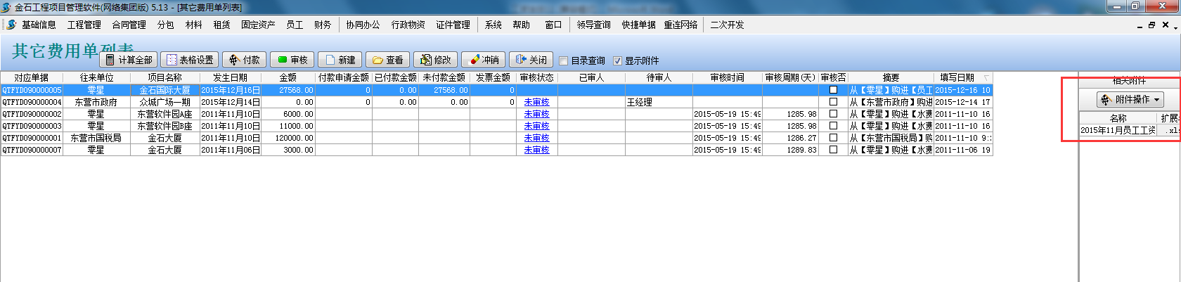 在工程管理軟件將所有人員實(shí)發(fā)工資做為一個(gè)總數(shù)錄入到【其它費(fèi)用單】中,也可一個(gè)項(xiàng)目錄入一個(gè)【其它費(fèi)用單】。工資單的可以通過Excel附件掛到其它費(fèi)用單下。本方法適合企業(yè)已有相關(guān)的財(cái)務(wù)軟件或Excel來處理工資表,又不想在金石中花費(fèi)精力詳細(xì)錄入。