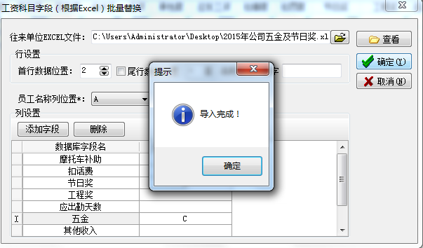 本地帶有員工本月五金和節(jié)日獎(jiǎng)字段的表格中所對應(yīng)的列分別是“B”列和“C”列,列名對應(yīng)好之后,點(diǎn)擊“確定”進(jìn)行替換,導(dǎo)入并替換完成之后會彈出“導(dǎo)入完成”的對話框,如圖: