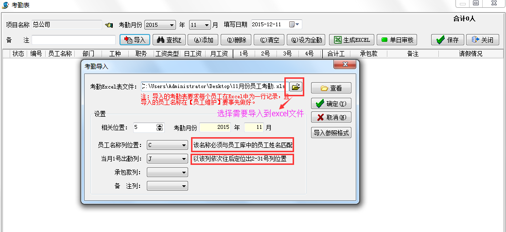 注:(1)如果合計(jì)工區(qū)分了項(xiàng)目名稱,如張三在A項(xiàng)目出勤10天,B項(xiàng)目出勤15天這種情況要建立兩個(gè)項(xiàng)目的考勤表對應(yīng)導(dǎo)入。