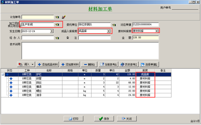 注:(1)在材料加工單的材料列表中對(duì)應(yīng)好各材料所在的庫房。否則系統(tǒng)會(huì)默認(rèn)為默認(rèn)的“成品入庫庫房”或“原材料庫房”。