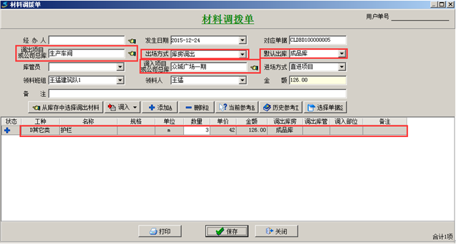 項(xiàng)目上使用產(chǎn)成品時(shí),需要從“生產(chǎn)車間”將產(chǎn)品調(diào)撥到項(xiàng)目上,在工程管理軟件中做“材料調(diào)撥單”,填寫調(diào)撥單時(shí),調(diào)出項(xiàng)目要選擇“生產(chǎn)車間”,出廠方式選擇“庫房調(diào)出”,并選擇對(duì)應(yīng)的庫房,選擇對(duì)應(yīng)的調(diào)入項(xiàng)目以及“領(lǐng)料班組”和“領(lǐng)料人”。如圖:
