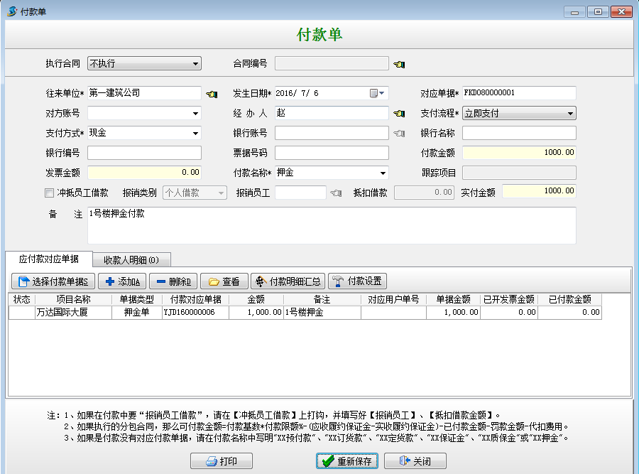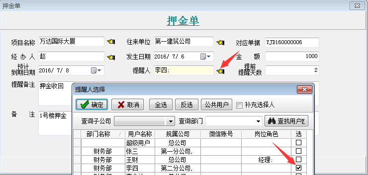 1.建立押金單、押金提醒(導入附件)->審核確認(支持多級審核)