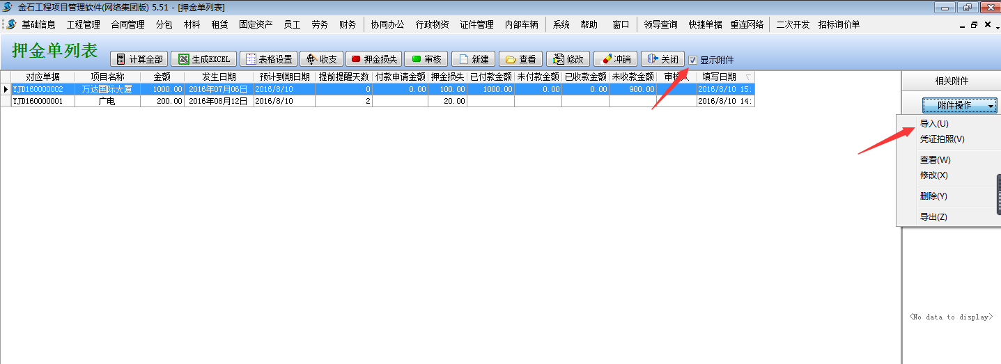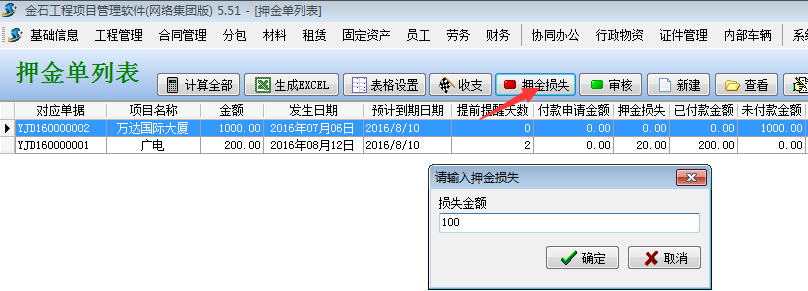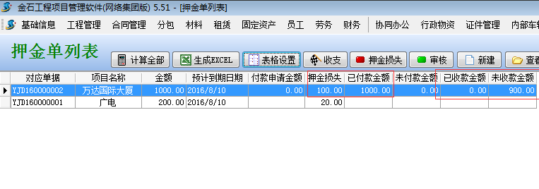金石工程項目管理軟件押金管理未收款的計算原則: 押金已付款且“已到預計到期日期”,未收款金額=已付款金額—已收款金額—押金損失