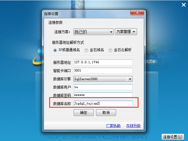 2.打開金石客戶端→連接設置,更改下數據庫名稱為我們還原的數據庫名稱Jzgdgl_TuJian2