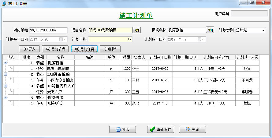 新建【施工計(jì)劃單】,先添加節(jié)點(diǎn),在添加任務(wù),輸入工程量、負(fù)責(zé)人、計(jì)劃開工日期等信息