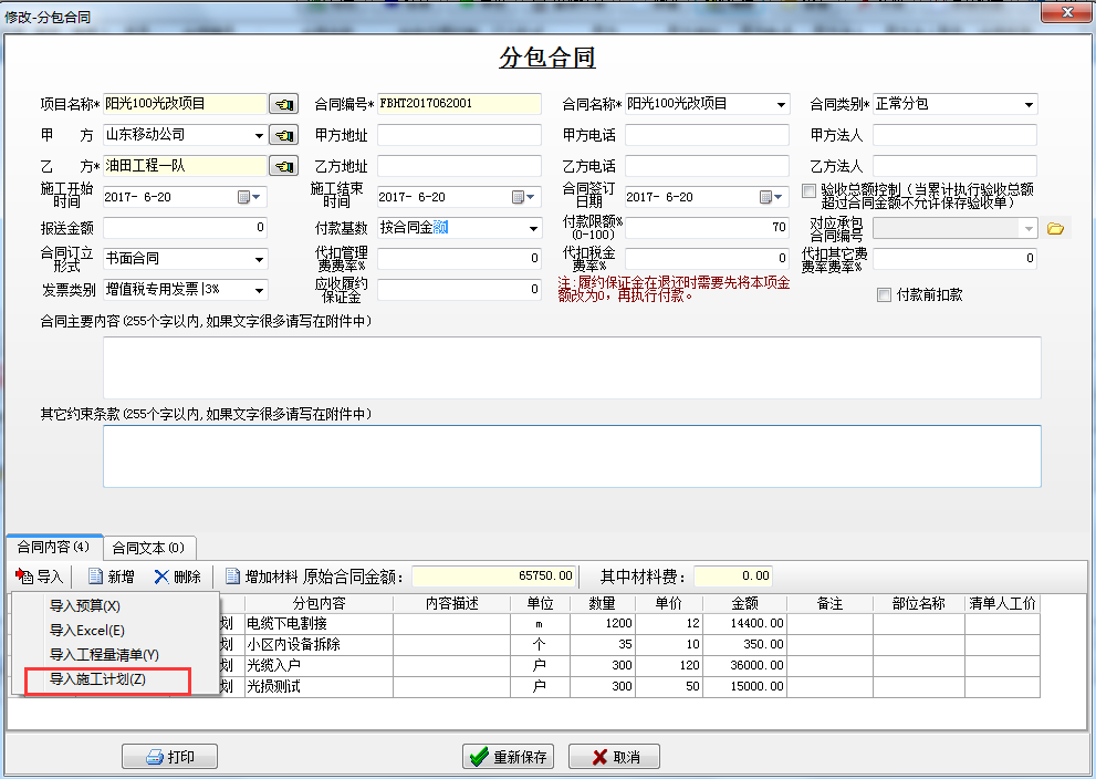 建立分包合同,導(dǎo)入施工計(jì)劃的內(nèi)容