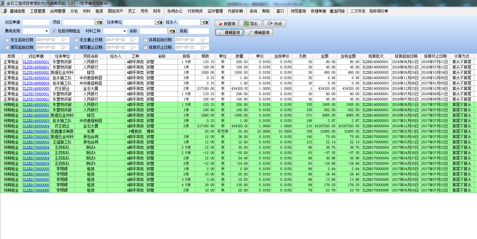 在租賃管理方便,經常租一些周轉材料,跟租賃公司都是長期合作,結算方式都是采用季度結算或者年度結算,之前采用紙質或者excel統計,統計并不準確,到季度或者年度結算時往往統計不準確,都是按照供應商提供數據進行結算,具體租賃費并沒有參考依據。采用金石項目管理軟件后,可以實時查看租賃情況,統計租賃庫存,并且最后結算時選好結算批次可以自動計算結算租金。在租賃過程中并可以實時查看預期租金,評估預期成本。采用采用金石項目管理軟件后租金統計準確,對后期結算產生了很大的幫助。