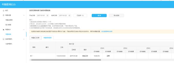 選擇好時(shí)間段,和考勤員工后,點(diǎn)擊查詢按鈕,出現(xiàn)如下圖所示