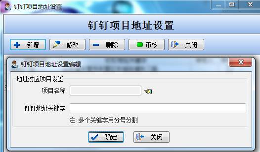 點(diǎn)擊新增選擇對應(yīng)的項(xiàng)目名稱和填寫對應(yīng)的釘釘?shù)刂逢P(guān)鍵字。如果有多個(gè)關(guān)鍵字用分號分開。
