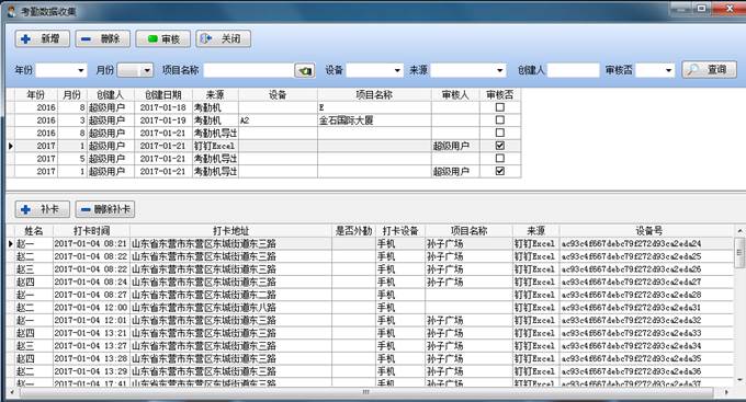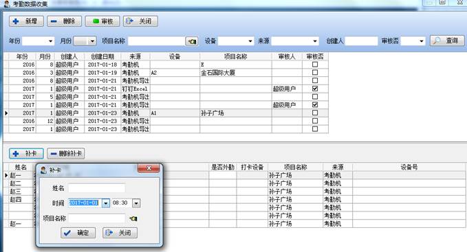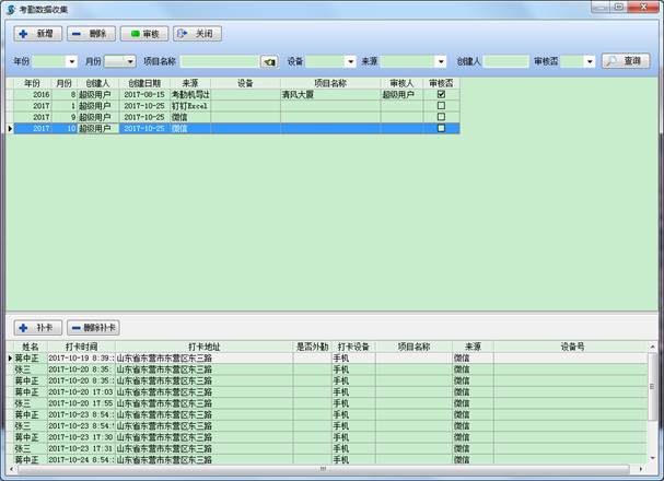 在考勤設(shè)備讀取操作界面也有相應(yīng)的查詢篩選項(xiàng),可以通過年份、月份、項(xiàng)目名稱、設(shè)備、來源、創(chuàng)建人、審核否等相關(guān)信息來篩選查詢從考勤設(shè)備讀取的信息。
