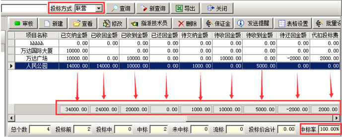 在工程管理軟件項目開拓列表中可以查詢多個項目投標保證金的九項合計,如圖所示:也可根據投標方式、業(yè)務員、項目狀態(tài)查詢。