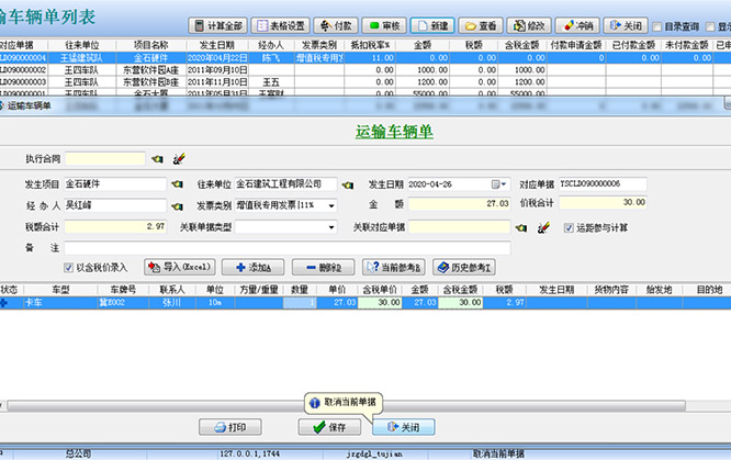 該單據(jù)是工程管理系統(tǒng)中車輛管理的基礎(chǔ)憑證,單據(jù)內(nèi)部的數(shù)據(jù),會對【工程成本】、【應(yīng)付賬款查詢】、【供應(yīng)商應(yīng)付賬款匯總查詢】、【運(yùn)輸車輛匯總表】這幾個模塊產(chǎn)生影響。