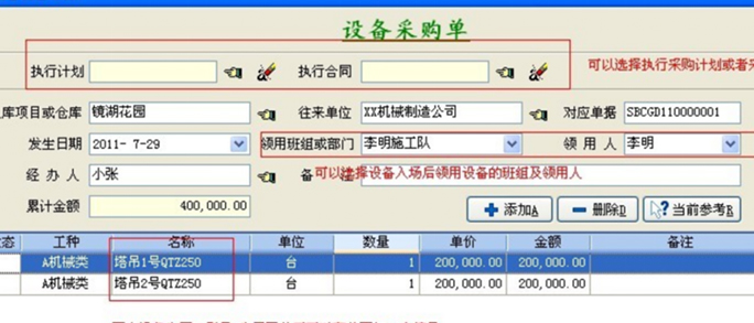 在使用機械設備的過程由于老化、意外事故等情況,需要重新采購設備。那么可以執行設備采購合同,設備的基礎信息可以直接從合同中導入。
