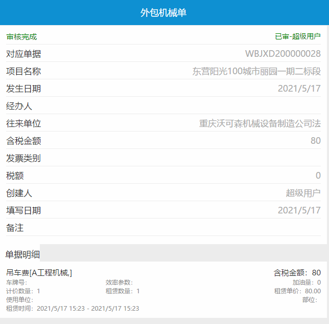 適用單據:外包人工單、材料采購單、運輸車輛單、外包機械單、租賃結算單、其它費用單、設備采購單、設備維修單、勞務考勤單、勞務加班單、勞務計件單、勞務預支單、勞務工資單。